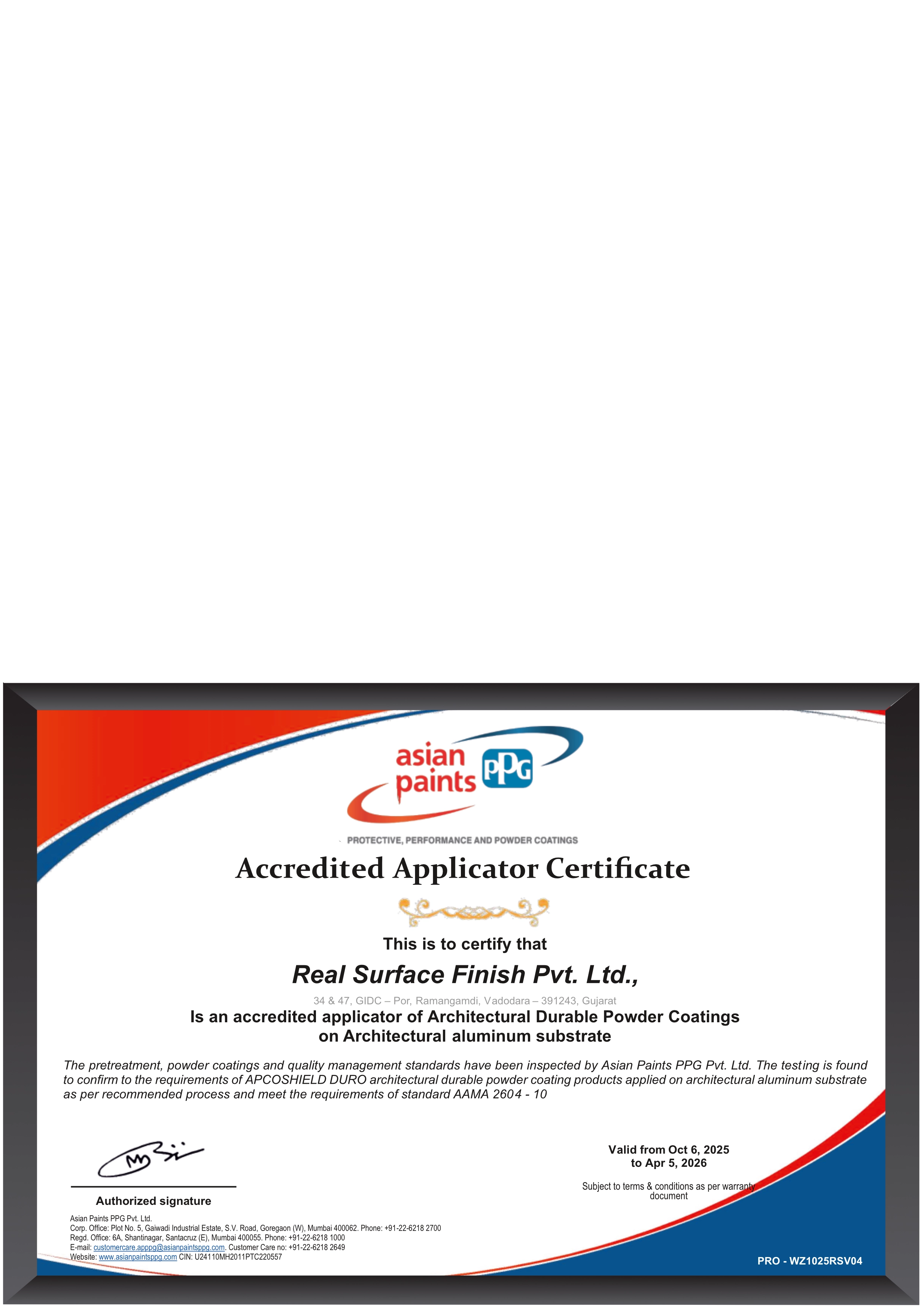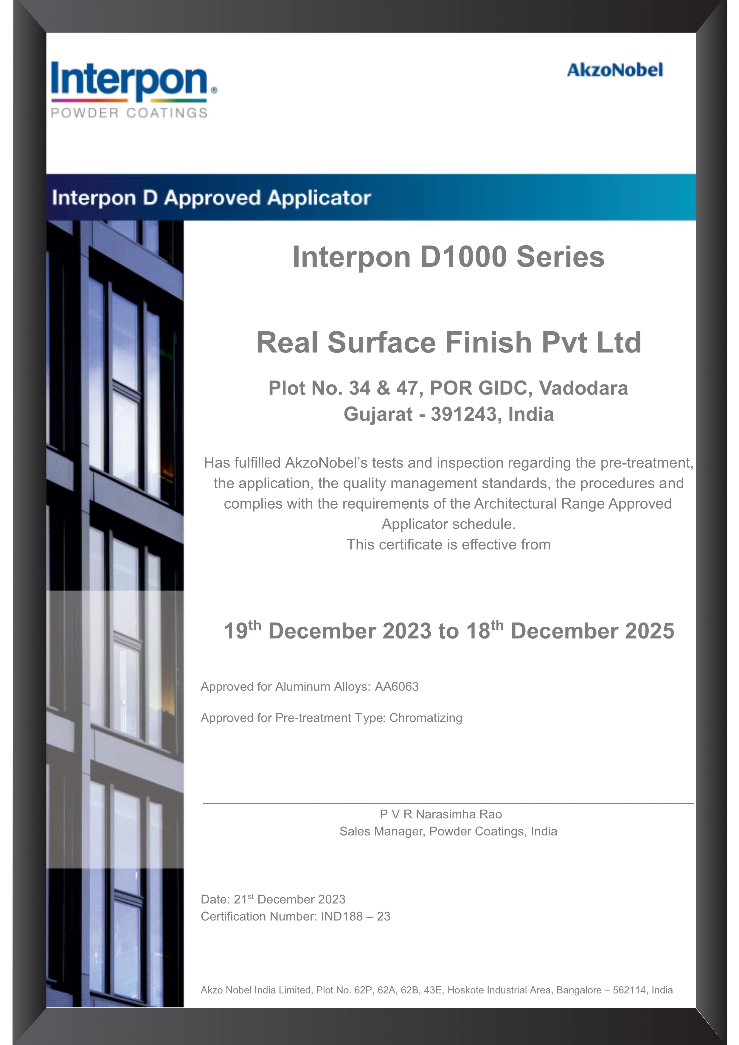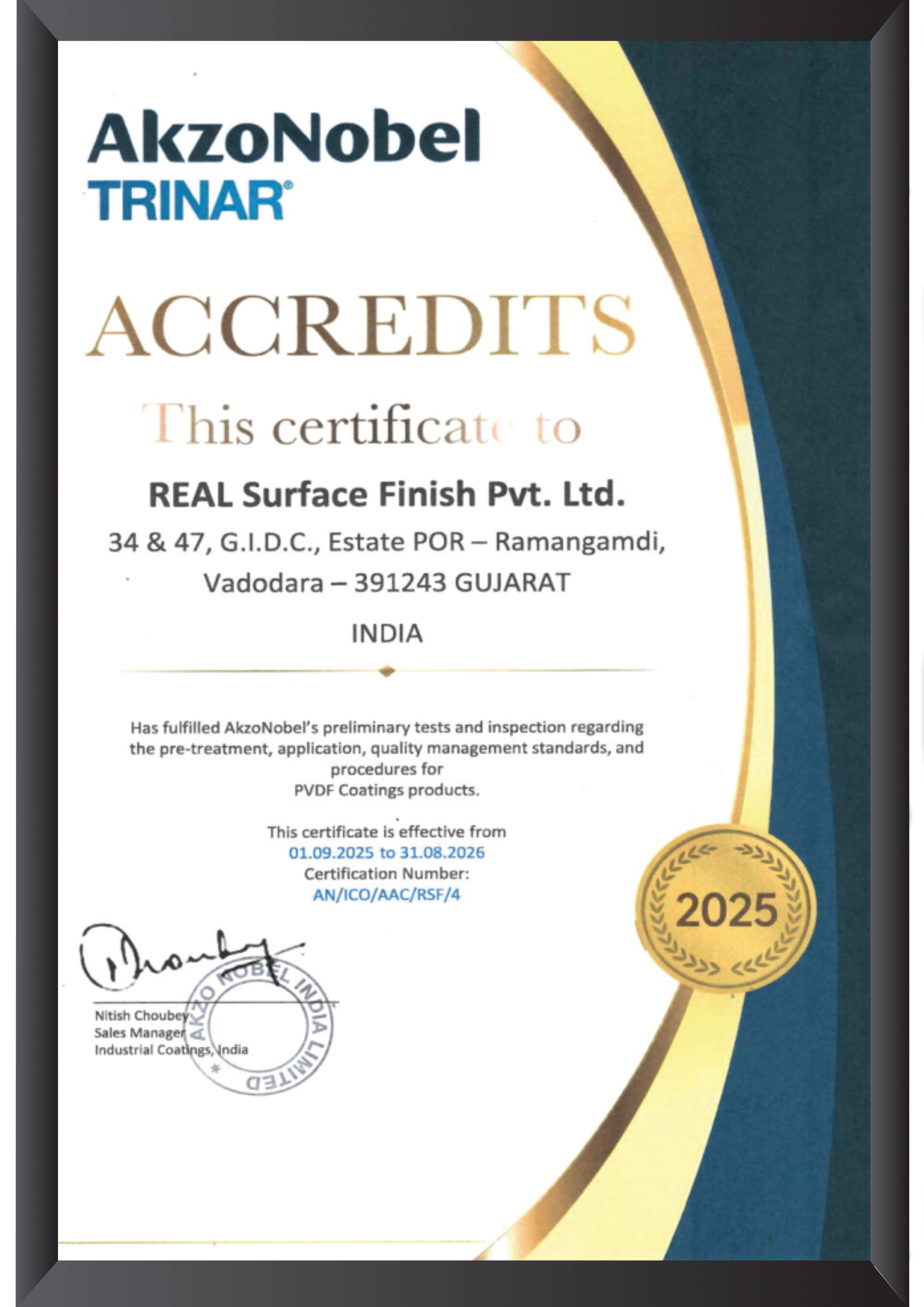 Real Surface Finish takes immense pride in being a certified applicator of high-performance PVDF and Powder Coatings by AkzoNobel, a global leader in coating solutions. This certification reflects our unwavering commitment to delivering superior quality and innovation in surface finishes.